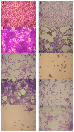 Effect of various concentrations of tested compounds on HepG-2 cell inhibition activity. (1) Control HepG-2 (2) compound 6 (7.8 µg/mL), (3) compound 14 (7.8 µg/mL), (4) compound 14 (125 µg/mL), (5) compound 6 (125 µg/mL), (6) compound 6 (500 µg/mL), (7) compound 12 (7.8 µg/mL), (8) compound 12 ( 125 µg/mL), (9) compound 16 (500 µg/mL), and (10) compound 14 (500 µg/mL).