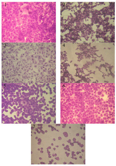 Effect of various concentrations of tested compounds on MCF-7 cell Inhibition activity. (1) Control MCF-7 (2) compound 14 (500 µg/mL), (3) compound 6 (7.8 µg/mL), (4) compound 6 (500 µg/mL), (5) compound 12 (7.8 µg/mL), (6) compound 12 (31.25 µg/mL), and (7) compound 12 (500 µg/mL).