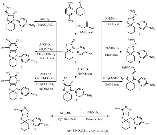 In continuation of our earlier interest on the synthesis of a wide range of applicable heterocyclic compounds [11,12,13,14,15,16,64,65,66,67,68,69,70,71,72,73,74,75,76,77], the starting compound 4-(4-aminophenyl)-1-thia-4-azaspiro [4.5]decan-3-one (1) was prepared by condensation between cyclohexanone, p-phenyllenediamine, and thioglycolic acid in dry toluene. Compound 1 was reacted with nitrogen nucleophiles such as hydrazine hydrate, phenylhydrazine, and/or thiosemicarbaxzide to give the hydrazones 2–4, respectively. The IR and 13C-NMR spectra of compounds 2–4 displayed the absence of the C=O group and the presence of a new signal discriminatory for NH2 and NH groups in both IR and 1H-NMR spectra, in addition to the presence of the C=S signal in 13C-NMR for compound 4 at δ 179.69 ppm (Scheme 1; c.f. experimental). Further, compound 1 underwent diazotization condition in the presence of 4-nitroaniline, which afforded the hydrazono derivative 4-(4-aminophenyl)-2-(2-(4-nitrophenyl) hydrazono)-1-thia-4-azaspiro[4.5]decan-3-one (5) in good yield. The 1H-NMR spectrum for hydrazono derivative 5 exhibited the absence of two signals specified to active thiazolomethylene protons and the presence of new signals distinguished for the NH group at δ 7.33 ppm (s, 1H; D2O exchangeable); (Scheme 1; c.f. experimental). Furthermore, compound 1 was refluxed with active methylene derivatives, namely, malononitrile and/or ethyl cyanoacetate in the presence of both 4-chlorobenzaldehyde and ammonium acetate, which yielded the corresponding aminospirothiazolo pyridine–carbonitrile derivative 6 and spirothiazolo pyridinone–carbonitrile derivative 7, respectively. The IR spectrum of compound 6 showed absorption bands characteristic for new C≡N and NH2 groups at 3122 and 2210 cm−1, respectively, in addition to the disappearance of the signal characteristic for the C=O group. The 1H-NMR spectrum for derivative 6 showed absence of signals specified to active thiazolomethylene protons in addition to the appearance of new signals for the new NH2 group at δ 8.61 ppm, exchangeable with D2O. Furturmore, 13C-NMR for compound 6 showed a specified signal for the C≡N group at δ 114.69 ppm with the absence of the signal for the C=O group (Scheme 1; c.f. experimental).