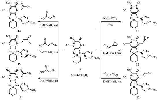 To a solution of compound 7 (0.01 mol) in dry DMF (20 mL), sodium hydride (0.24g, 0.01 mol) was added, then the reaction mixture was stirred at 70 °C for 3 h; the reaction mixture was cooled and then epichlorohydrine, chloroethanol, bromoacetic acid, bromopropionic acid, and/or ethyl bromo acetate (0.01 mol) was added, and stirring at room temperature was continued for 5 h. The reaction mixture was evaporated under reduced pressure; the residue was washed with distilled water, filtered off, dried, and recrystallized from dioxane to give compounds 12‒16.