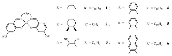 - Chakraborty, S.; Bhattacharjee, C.R.; Mondal, P.; Prasad, S.K.; Rao, D.S.S. Synthesis and aggregation behaviour of luminescent mesomorphic zinc(II) complexes with ‘salen’ type asymmetric Schiff base ligands. Dalton Trans. 2015, 44, 7477–7488. [Google Scholar] [CrossRef] [PubMed]