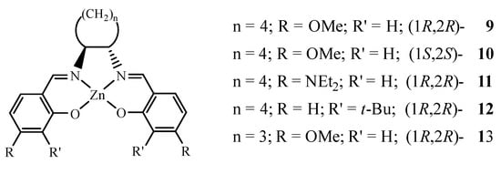 Some chiral ZnL complexes (9–13) were also investigated (Figure 7). In particular, complexes derived from the enantiopure chiral (1S,2S)-(+)- or (1R,2R)-(‒)-trans-1,2-diaminocyclohexane and (1R,2R)-trans-1,2-cyclopentanediamine were synthesized and studied in solution [66,67,68], in comparison to previous achiral complexes [27,60,61,62,63].