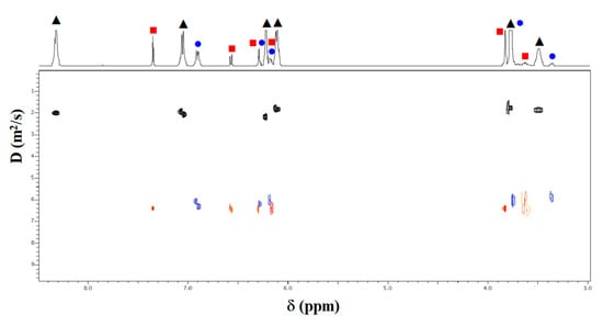 1H NMR DOSY spectrum of 9 in CDCl3. The labeling of 1H NMR signals refers to species 9A (black triangles), 9B (blue circles), and 9C (red squares). Reproduced with permission from Ref. [66]. Copyright (2016) American Chemical Society.