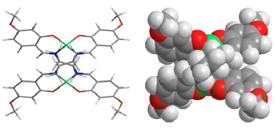 To obtain a sufficient solubility both in non-coordinating and coordinating solvents, various derivatives, changing the length of the alkoxy chain, were synthesized. However, results shown that the alkyl side chains length plays a very minor role in the aggregation properties of such species [60,61,62]. Interesting enough is the 1H NMR behavior observed for the complex derived from cis-1,2-diaminocyclohexane 2 in CDCl3 solution [27]. In fact, H2, H3, H4, and –OCH3 signals are split into two signals with the same intensity, consistent with a single dimeric species having an asymmetric structure, further supported by DOSY NMR, as also observed in the solid state by X-ray crystal structure analysis [27].