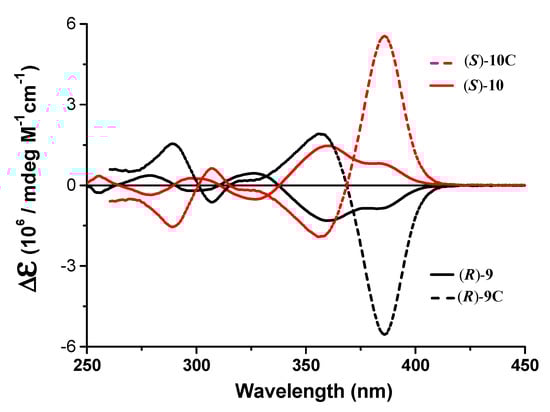 CD spectra of (R)-9 and (S)-10 in CHCl3 before and after heating (species (R)-9C and (S)-10C). Adapted with permission from Ref. [66]. Copyright (2016) American Chemical Society.