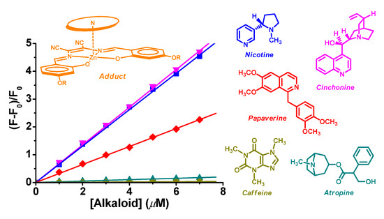 - Oliveri, I.P.; Di Bella, S. Highly sensitive fluorescent probe for detection of alkaloids. Tetrahedron 2011, 67, 9446–9449. [Google Scholar] [CrossRef]