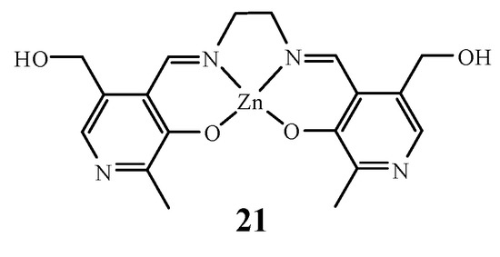 As far as the recognition of anions in aqueous solutions, a Zn(II) complex derivative from pyridoxal with ethylenediamine (21, Figure 19) was found to be selective for the fluorescent detection of ADP and ATP [101]. This is consequence of the complementary coordination of the phosphate groups to the metal center, corroborated by hydrogen bonding of the nucleotide with the coordinated ligand. Moreover, a Zn(salphen)-bile-acid conjugate in an aqueous solution of CTABr micelles was found to bind phosphate, analogously to the binding of anions of the complex in DMSO solution [102].