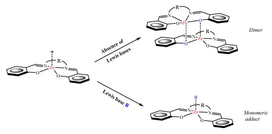 The Lewis acidic character of ZnL complexes can be related to the structure of the tetradentate N2O2 Schiff-base ligand. In fact, the ring strain that would be generated by the diimine bridge does not allow to reach a tetrahedral coordination around the Zn(II) atom, constraining the metal center in a distorted planar geometry (Figure 2). As a consequence, monomeric ZnL complexes are unstable, coordinatively unsaturated species. Conversely, ZnL′2 complexes of bidentate NO Schiff base ligands, L′, were always found as monomeric species in a pseudo-tetrahedral coordination around the Zn(II) atom (Figure 2) [19,20,21,22], independently from the presence of Lewis bases. In other terms, in the absence of sterical constraints the formation of tetrahedral structures is favored.