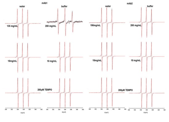Experimental (black) and simulated (red) X-band CW EPR spectra of TEMPO in mAb1 and mAb2 solutions of different concentrations in pure water and buffer are shown. Also, the spectra of 200 µM spin probe solutions in water and buffer as reference is given.