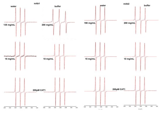 Experimental (black) and simulated (red) X-band CW EPR spectra of CAT1 in mAb1and mAb2 solutions of different concentrations in pure water and buffer are shown. Also, the spectra of 200 µM spin probe solutions in water and buffer as reference are given.