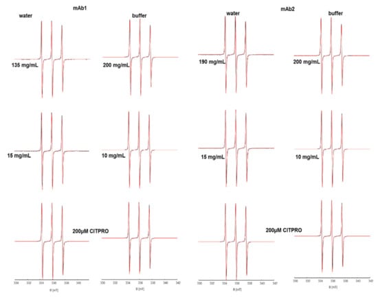 Experimental (black) and simulated (red) X-band CW EPR spectra of CITPRO in mAb1 and mAb2solutions of different concentrations in pure water and buffer are depicted. Also, the spectra of 200 µM solution of spin probe in water and buffer as reference are given.