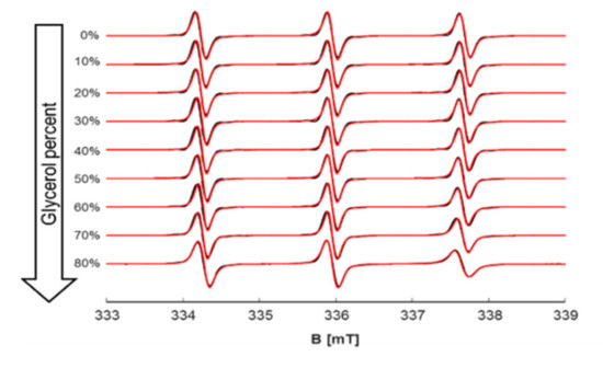 Experimental (black) and simulated (red) X-band CW EPR spectra of 200 µM TEMPO dissolved in 10 mM citrate buffer at different glycerol contents. Increasing the viscosity results in much slower rotational correlation times and line broadening.