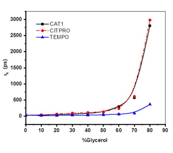 Among the examined spin probes and at highest viscosity condition (80% glycerol), TEMPO has the smallest change in correlation times, due to its amphiphilic properties and low propensity of being solvated in protic solvents like glycerol/water. On the other hand, CAT1 and CITPRO are highly sensitive to H-bonding with solvent molecules and thus are more prone to sense changes in viscosity of these solvents by experiencing a huge slowdown of their dynamics (Figure 5).