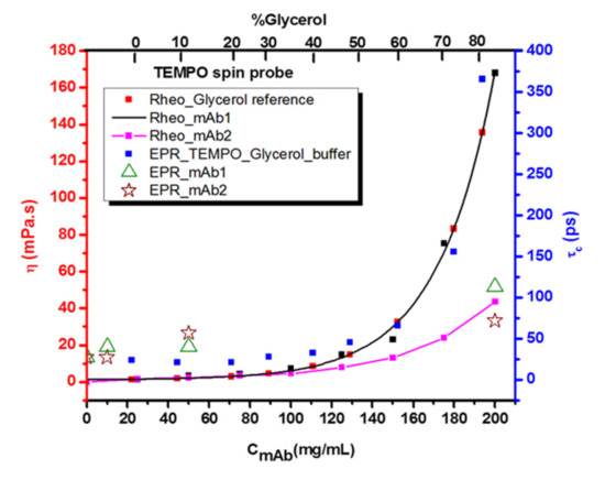Correlation plot between dynamic viscosities (η) and rotational correlation times () as a function of mAb concentration (lower x-axis) and glycerol content (given in %, upper x-axis) for TEMPO-mAb (green and red symbols) and TEMPO–Glycerol and glycerol as reference (in blue and black squares) systems.