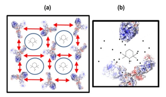 The internal structure as detected by TEMPO changes drastically, when even small amounts of buffer are added. While macroscopically (viscosity), the changes are moderate, indicating that a long-range, probably transient, electrostatic/dipolar network of mAb1 still persists, locally the addition of the charged buffer (citrate) seems to screen parts of the charge patches on the surface, so that locally antibodies may approach closer than in pure water. TEMPO has been shown to be an excellent probe of even small hydrophobic or less hydrophilic regions through its favorable partitioning into these regions (see [20,21,22,31]) and immediately senses these protein-enriched regions when they appear. Since the respective spectral fraction of TEMPO in less polar regions that impede rotational motion only shows up at high concentration of antibody, they cannot be a mere effect of “attaching” TEMPO to mAb1 but at least two mAbs are necessary in closer contact. We have schematically summarized this in Figure 7b. Taken together, TEMPO is dissolved in two types of water in mAb1 solutions, interstitial water that effectively resembles bulk water, in large, transient protein-protein networks in pure water, and water in the solvation shell of mAb1 proteins when the charges are partly screened through added buffer (Figure 7).