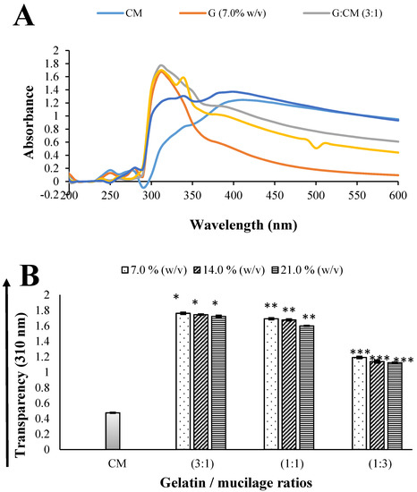 Ultraviolet (UV)-visible absorbance spectra (A) and transparency at 310 nm (B) of soft capsule-forming solutions as a function of concentration of Gelatin (G) and of the gelatin/cactus mucilage (G/CM) ratios (3:1, 1:1 and 1:3). All data are the mean of measurements (n = 3) ± standard deviation. Different asterisks in the same column for each solution indicate a statistical difference (p < 0.05) between samples.