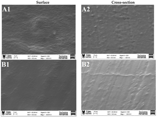 The scanning electron microscope (SEM) micrographs of CMC and CC are presented in Figure 2. The composite capsule (Figure 2A1) revealed a rough and bumpy surface. A morphology like this suggests interaction between G and CM, which is in line with our FTIR analysis (see Section 2.2.2) and also indicates the presence of insoluble material (mucilage) in the capsule-forming solution [27]. Jamróz et al. [30], observed similar results in furcellaran–gelatin films. The micrographics of the cross-section (Figure 2A2) show short, scattered craters that indicate some heterogeneity in the matrix, which may have influenced the high water solubility (see Section 2.1.3).
