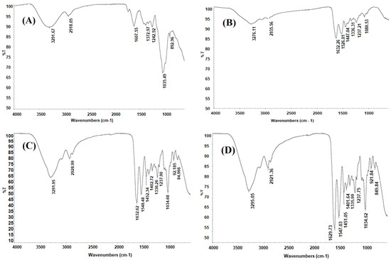 Fourier transform infrared (FTIR) spectra: (A) CM, (B) gelatin, (C) control capsule and (D) composite capsule, scanned at wavenumbers 4000–400 cm−1.