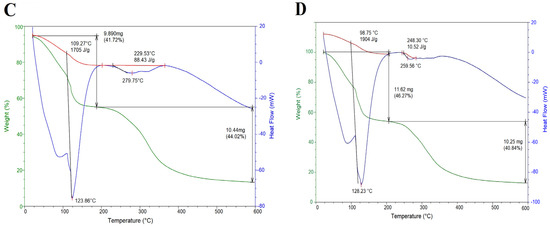 Representative DSC/TGA curves: (A) cactus mucilage (CM), (B) gelatin, (C) composite capsule and (D) control capsule.