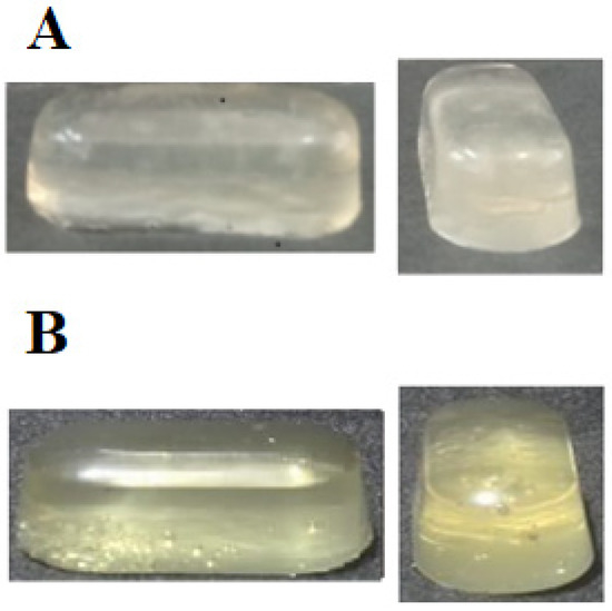 The appearance of soft capsules: (A) composite capsule and (B) control capsule.