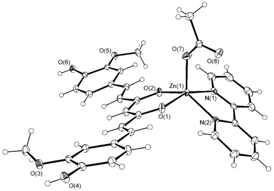 - Brahma, S.; Sachin, H.P.; Shivashankar, S.A.; Narasimhamurthy, T.; Rathore, R.S. Adducts of Bis(Acetylacetonato)Zinc(II) with 1,10-Phenanthroline and 2,2′-Bipyridine. Acta Cryst. C Cryst. Struct. Commun. 2008. [Google Scholar] [CrossRef] [PubMed]