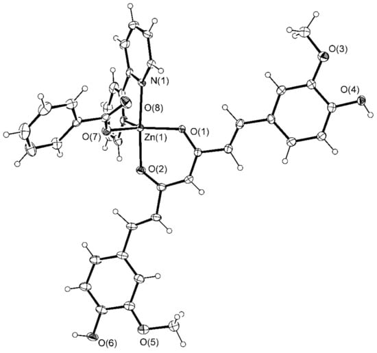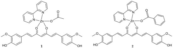 To the best of our knowledge, only one crystal structure of a zinc(II) complex with curcuminate has been reported so far [36]. Our work has focused on Zn(II) complexes with curcuminate, 2,2′-bipyridine, and carboxylates. The variation of ligand types and their steric effect around the metal center is an essential parameter for modulating (tuning) the solubility, stability, and biological activities of metal complexes. In some studies, bipyridine derivatives have proven to be suitable spectator ligands to complete the metal ion coordination sphere along with cur−, and thereby improve the crystallization of the complex [36,39,40]. Acetate ions in Pt(II) complexes were shown to significantly enhance their solubility in water and chemical stability compared to the parent chlorides, while a benzoate ligand in a kiteplatin Pt(IV) analog has boosted its cytotoxicity [41,42].