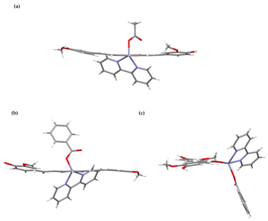 The FTIR spectra of curH and the title compounds are presented in Figures S15–S17 and the absorption bands are listed in the experimental section. The assignment of bands in the spectrum of curH follows the literature report for the β-keto-enol tautomer [57,58]. Phenolic ν(OH) vibrations absorb at 3510 cm−1. Strong bands at 1626 and 1601 cm−1 have mixed ν(C=O) and ν(C=C) character. The most intense band in the spectrum of curH at 1500 cm−1 belongs to mixed vibrations (ν(C=O), δ(CC=O), and δ(CC1C)). Bands at 1458 and 1427 cm−1 have their origin in deformation vibrations of the two methyl groups. Intense bands between 1277 and 1180 cm−1 are attributed to the in-plane deformation vibration of phenyl rings and skeletal in-plane deformations. However, for both compounds the assignment of cur− bands could be inaccurate due to the overlay with the byp and acetate/benzoate absorptions (Figure S18). The latter also hampers identification of the carboxylate-binding mode in their infrared spectra, which is possible for simpler complexes from the positions of the νas(COO) and νs(COO) absorptions [59,60].