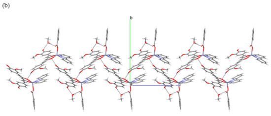 The presence of another structural element capable of hydrogen-bonding in [Zn(CH3COO)(cur)(bpy)](1)·CH3OH·2H2O, i.e., water molecules of crystallization, leads to a more complicated pattern of connectivity. Again, all good hydrogen-bond donors are involved (Table 3). One of the two hydroxyl moieties is engaged in an intermolecular interaction with a free carboxylate oxygen, whereas the other is hydrogen-bonded to a water molecule. The shortest O∙∙∙O contact involves the hydroxyl and the carboxylate. The [Zn(CH3COO)(cur)(bpy)](1) and water molecules are linked into layers with methanol molecules attached to their surfaces (Figure 7). Methanol molecules serve as linkers between the layers. The π–π stacking interactions between 2,2′-bipyridine rings may also be observed (centroid–centroid distance = 3.815(1) Å, interplanar distance = 3.4214(8) Å, dihedral angle = 0.95(9)°, offset angle = 26.3°) [54].