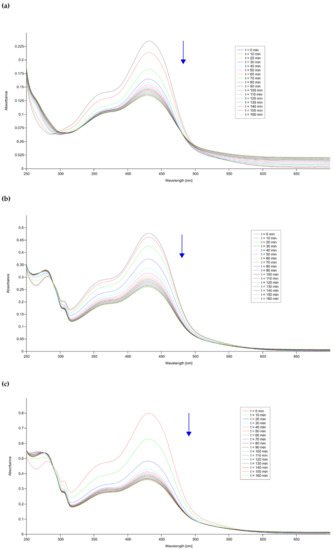 Time-dependent UV-vis spectra of (a) curH, (b) 1, and (c) 2 in 90 vol.% phosphate buffered saline (PBS, pH = 7.2) + 10 vol.% DMSO solutions.