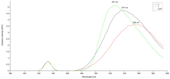 Emission spectra of 0.1 µM curH, 1, and 2 in DMSO (λex = 435 nm for curH; λex = 431 nm for 1 and 2).