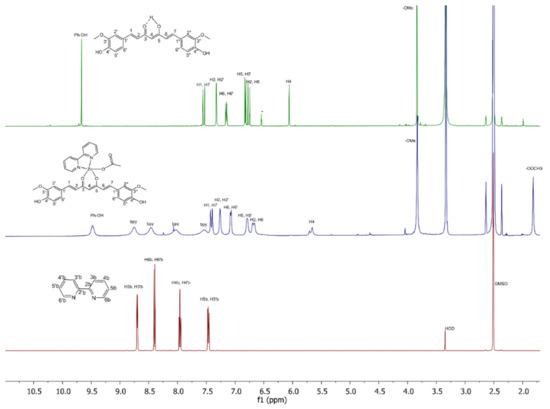 1H NMR (500 MHz) spectra of yellow pigment curcumin (curH, top), complex 1 (middle), and bpy (bottom) in DMSO-d6.
