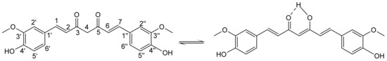 The structure of curH, ((1E,6E)-1,7-bis(4-hydroxy-3-methoxyphenyl)hepta-1,6-diene-3,5-dione), consists of two phenols with methoxy groups in the ortho position joined by a seven-carbon flexible spacer with a β-diketone moiety and two carbon–carbon double bonds [10,11]. The diketone group exhibits tautomerism with the β-diketone and two equivalent asymmetric keto-enol tautomers (Scheme 1).