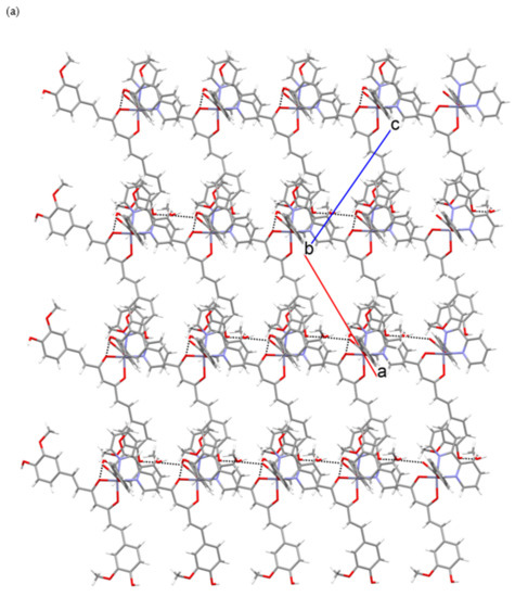 The presence of another structural element capable of hydrogen-bonding in [Zn(CH3COO)(cur)(bpy)](1)·CH3OH·2H2O, i.e., water molecules of crystallization, leads to a more complicated pattern of connectivity. Again, all good hydrogen-bond donors are involved (Table 3). One of the two hydroxyl moieties is engaged in an intermolecular interaction with a free carboxylate oxygen, whereas the other is hydrogen-bonded to a water molecule. The shortest O∙∙∙O contact involves the hydroxyl and the carboxylate. The [Zn(CH3COO)(cur)(bpy)](1) and water molecules are linked into layers with methanol molecules attached to their surfaces (Figure 7). Methanol molecules serve as linkers between the layers. The π–π stacking interactions between 2,2′-bipyridine rings may also be observed (centroid–centroid distance = 3.815(1) Å, interplanar distance = 3.4214(8) Å, dihedral angle = 0.95(9)°, offset angle = 26.3°) [54].