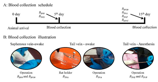 Flow chart of the whole experimental procedure (A) and demonstrations of the blood collection from the saphenous vein and the tail vein under awake/anesthesia states (B). Note: B: blood; SV0 or SV10: Blood collection from the saphenous vein after 0th or 10th day. TVA, TVS or TVP: Blood collection from the tail vein under awake or anesthesia state induced by sevoflurane or pentobarbital; ITVC: Blood collection from the inferior thoracic vena cava.