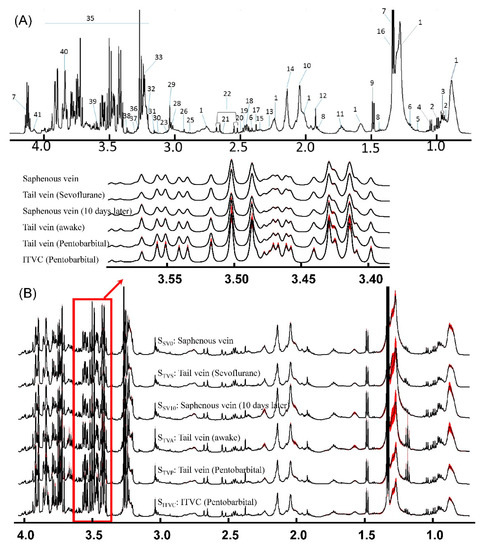 In order to evaluate the stability of these different blood collection methods, the average and the standard error of the mean (SEM) of the 1H-NMR spectrum in every group were calculated point by point after the spectral peak alignment was achieved (Figure 2B) [27]. The major metabolites in the blood sample are more stable with the blood collection methods in the awake animal from the saphenous vein (0 day-SSV0 or 10 days later-SSV10) or tail vein (STVs or STVA). The anesthesia could contribute to the variation of the components especially for pentobarbital (STVP). Furthermore, the bleeding site of ITVC could be used to obtain blood samples as often as necessary; however, the metabolic components are too varied, especially for glucose (SITVC).