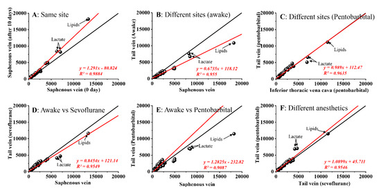 Comparing the blood samples from the saphenous vein under awake state in different periods, the major metabolic components of the blood samples were almost similar, except for lipids, which is far from the central line (y = x, Figure 4A, r = 0.9884,). Furthermore, lipids are also the major different component in different blood collection sites (saphenous vein vs. tail vein, Figure 4B) under awake state, however, the other small metabolites were almost similar (R = 0.9555). It was more stable under the anesthesia state induced by pentobarbital (Tail vein vs. ITVC, Figure 3(C)), especially for lipids. Under different anesthetics, the major metabolic components were varied (Figure 3(D–F)), especially for pentobarbital (R: 0.9087 for pentobarbital vs. 0.9549 for sevoflurane). Pentobarbital is a liquid anesthetic; thus, it probably changes the components of the blood sample more significantly. In order to check the contribution of the metabolites to the discrimination, further statistical analyses were implemented in the next section.