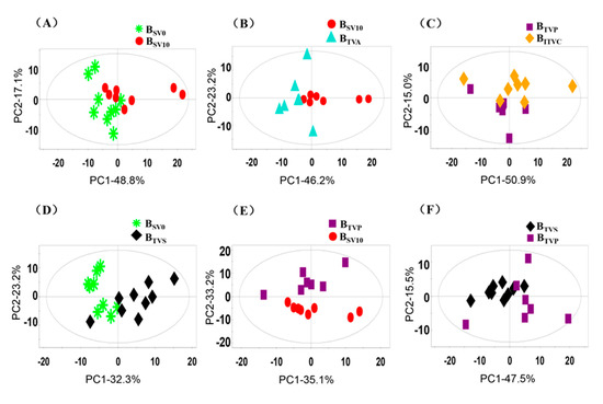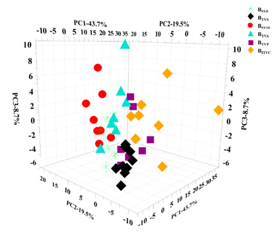 For all the samples, the top three principle components were calculated, which made 43.7%, 19.5% and 8.7% contribution to the total component, respectively. These three principle components made up a total of 71.9% of the variance and may play major roles. The loading plot of the samples with these three major components is illustrated in Figure 5. It should be noted that there was a separation trend for some samples, such as BITVC v.s. BSV0 or BSV10 or BTVS, BTVA v.s. BTVP, etc. Some samples were difficult to distinguish, such as BSV0 v.s. BSV10 or BTVA. Most of the samples were overlapped in the 3D-space; thus, the PCA analysis for two difficult kinds of samples were implemented in the next step.