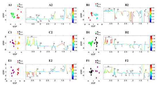 The results of these six different pattern recognition analyses are represented as score scatter plots (Figure 7A1–F1), which show the inherent clustering trends of the samples. The coefficient-coded loading plots established by MATLAB script were employed to identify the significant contributing metabolites among the serum samples from the saphenous vein and inferior thoracic vena cava (Figure 7A2–F2).