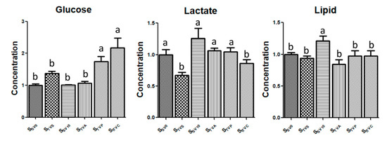 According to the results of OPLS-DA, the most significant different metabolites were lipids, lactate and glucose. The relative concentrations of these metabolites were calculated (Figure 8).