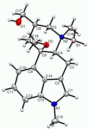 Aminoboranes [3] are usually known as hydrogenation agents. They offer some advantages over sodium borohydride, such as good solubility in organic solvents. They are less sensitive to acids and can serve as chiral reducing agents [4,5,6]. On the other hand, they are generally weaker reducing agents. Despite their popularity, very few crystal structures of boranes of alkaloids or pharmaceutical molecules have been described. As a rare example, the crystal structures of several borane complexes of cinchona alkaloids have been reported [7].