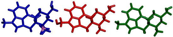 Side-oriented fitted molecules of Luol derivatives. BH3-MeLuol (4)—blue, Luol (5)—red, MeLuol (3)—green, boron—pink.