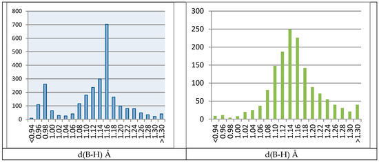 Histograms of bond lengths for all B–H bonds (left) and B–H bonds in probably refined BH3 groups (right).