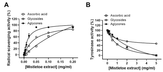 2.2. Aglycone-Rich Extract from Korean Mistletoe Scavenges ABTS Radical and Inhibits Tyrosinase Activity More Efficiently Than Glycoside-Rich Extract