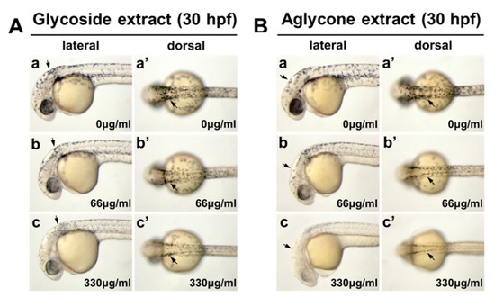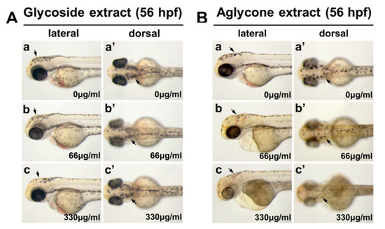 2.3. Aglycone-Rich Extract Has a More Potent Inhibitory Effect against Melanogenesis in Zebrafish Embryo Than Glycoside-Rich Extract