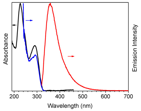 1 in CH3CN (10−5 M) at 298 K: normalized absorption (black line), emission (λexc = 300 nm, red line) and excitation spectra (λem = 358 nm, blue line).