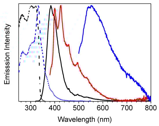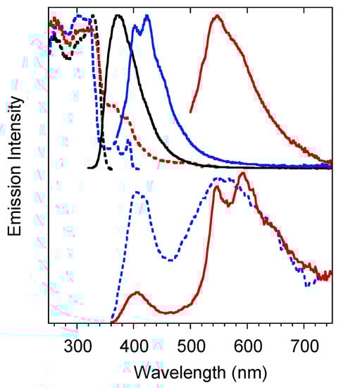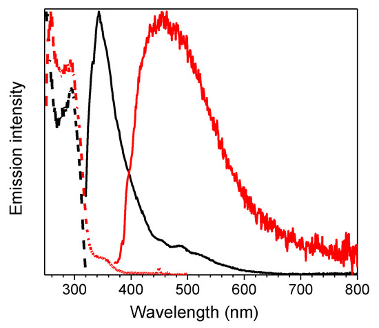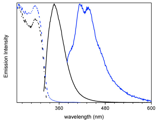 At 77 K, a slight blue shift (344 nm, τav = 4.05 ns) of the fluorescent emission was observed by exciting at 300 nm. Interestingly, at this low temperature, a weak phosphorescent low energy tail appeared in the PL spectrum and could be isolated (454 nm, τav = 1.63 s) from the fluorescent component by selectively populating the T1 level (λexc = 350 nm) (see Table 1 and Figure 2). On this regard, the importance of direct S0-T1 excitation of organic phosphorescent compounds has been highlighted by Huang and coworkers [19].