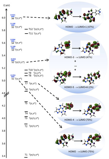 Electronic levels computed for 1 (left) and selected MO involved in the transitions (right) at molecular level. In blue are reported the singlet levels with the corresponding oscillator strengths f.