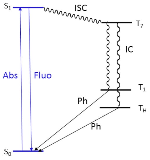 This crystal structure justifies both phosphorescent emissions (see Jablonski diagram reported in Figure 8). The molecular (high energy) component, visible in solution only at 77 K, appears at 298 K in the solid due to the rigidifying effect and protection from oxygen quenching ascribable to intermolecular interactions, and, on the other hand, the low energy phosphorescence can be associated to the presence of H aggregates in the crystal structure, in agreement with previous findings on compounds with the same triazinic scaffold [9,16,17,18]. This interpretation is in line to the results obtained from the PMMA blend in which the molecular phosphorescence is visible at 298 K thanks to the rigidifying effect of the PMMA matrix, while the low energy component is lacking due to the absence of supramolecular organization of the phosphor into H aggregates.