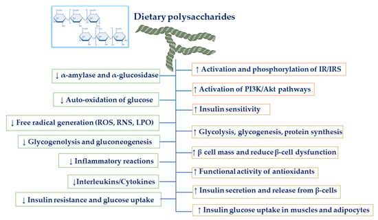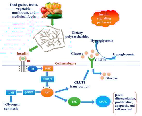 Polysaccharides are generally extracted from dietary materials by various physical, chemical, or enzymatic digestion treatments that can be found to have anti-diabetic potentials. The previous study showed that polysaccharides consumption could alleviate diabetes through mechanisms of action on gastrointestinal viscosity, gastrointestinal satiety, colon fermentation, and anti-gastrointestinal inflammation [68]. Similarly, the present study aimed to identify the various in vivo and in vitro trials in which dietary polysaccharides have hypoglycemic, antioxidant, and anti-inflammatory effects. Dietary polysaccharides enhance pancreatic β-cell mass, trigger insulin signaling pathways through insulin receptors, and activate the PI3K/Akt pathway. They modulate ERK/JNK/MAPK pathways and, thus, alleviate β-cell dysfunction.