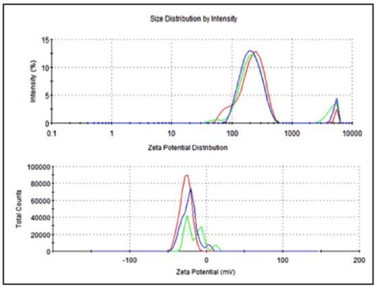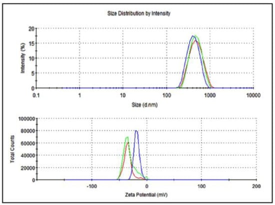 The average particle size of nanoemulsified vit-A was around 475.7 nm, and the zeta potential of the vit-A nanoemulsion was around −33.5 mV (Figure 2). Similarly, the average particle size of the nanoemulsified vit-C was around 225.4 nm, and the zeta potential of the vit-C nanoemulsion was around −21.3 mV (Figure 3). These low values may be due to the adsorption of light by vitamins.